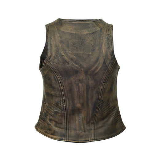 VANCE LEATHER HIGH MILEAGE LADIES DISTRESSED BROWN LACE SIDE VEST