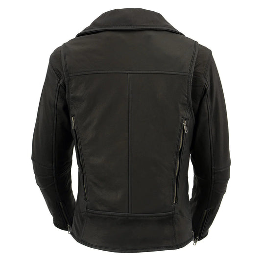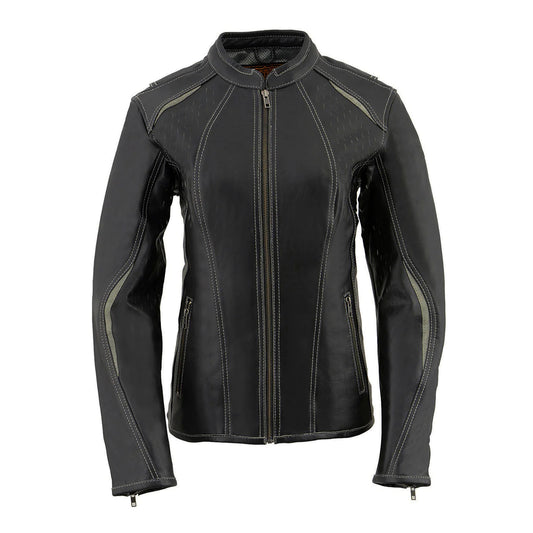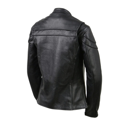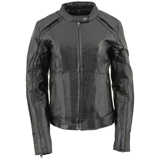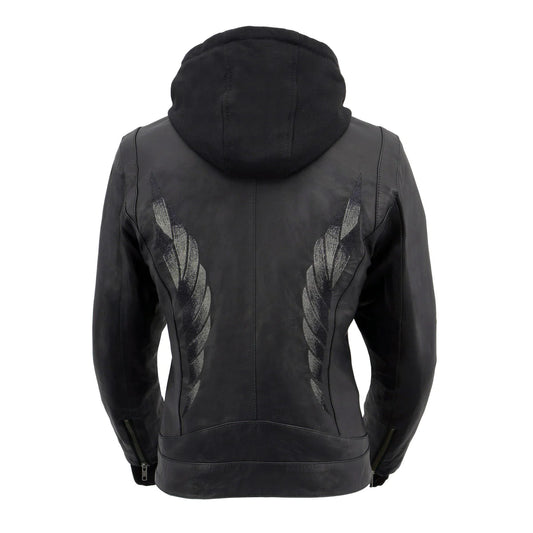 Women's Black Leather Vented Motorcycle Jacket w/ Removable Hoodie