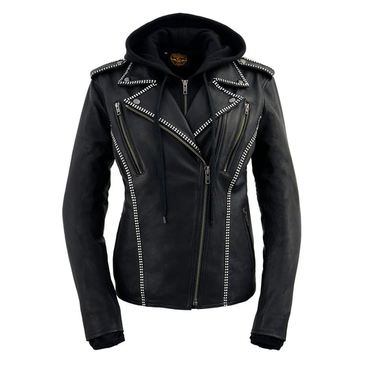 Women's Black 'Bedazzled' Leather Moto Jacket with Hoodie