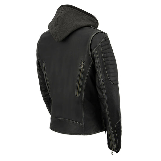 Black Leather Rub-Off Leather Jacket with Hoodie for Women