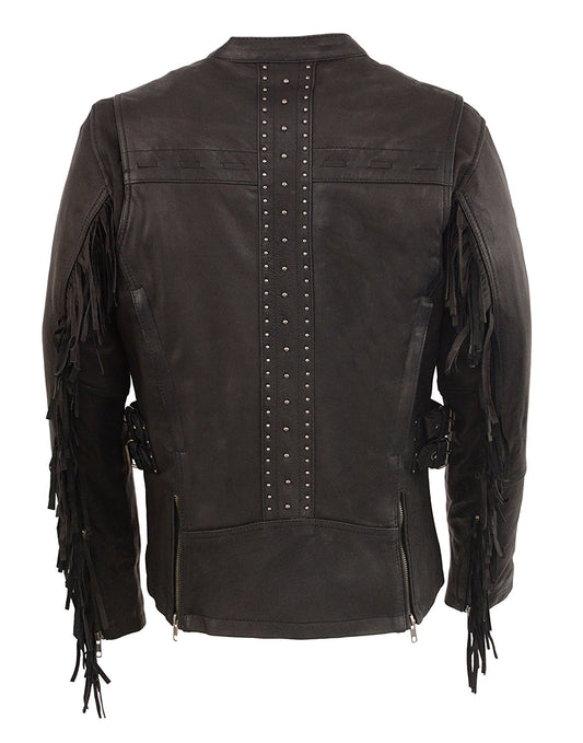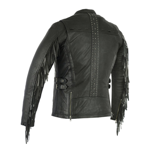 Women's Lightweight Fringed Black Leather Racer Jacket with Dual Gun Pockets