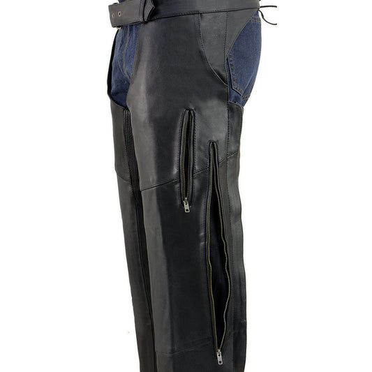 Men's Black Vented Motorcycle Leather Chaps with Stretch Thighs