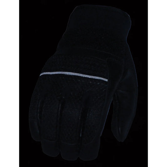 Men's Black Perforated Mesh Gel Palm Fingerless Motorcycle Hand Gloves W/ ‘Reflective Piping’