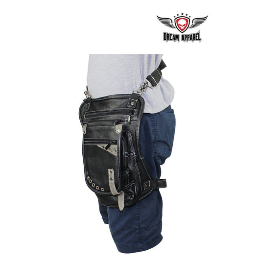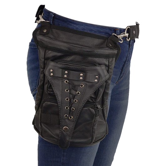 BLACK CARRY LEATHER THIGH BAG WITH WAIST BELT AND CONCEALED GUN POCKET