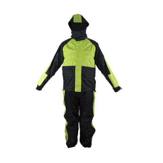 Two-Piece Black & Fluorescent Rain Suit With Zippered Side Seams