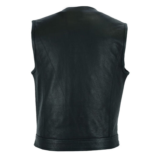 Men's Black Motorcycle Club Style Leather Vest with Concealed Snap Button Closure