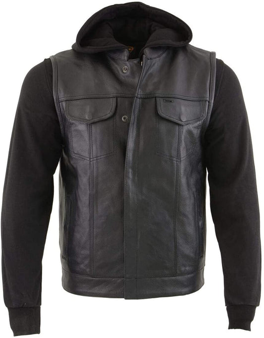 Men's Black Leather Club Style Vest with Full Sleeve Hoodie and Quick Draw Pocket