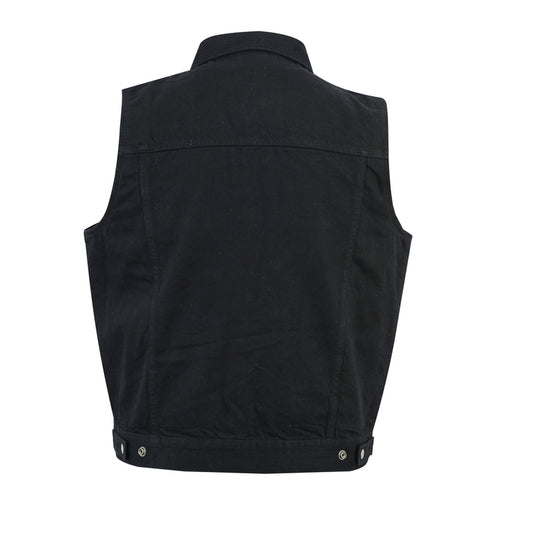 MENS BIKER BLK COTTON DENIM 10 POCKET VEST WITH 2 GUN POCKETS SINGLE PANEL BACK