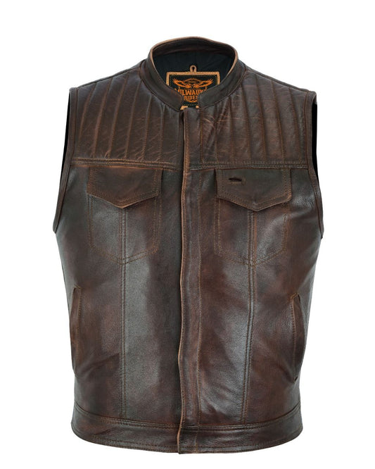 Men's Distressed Brown Dual Closure Open Neck Club Motorcycle Leather Vest