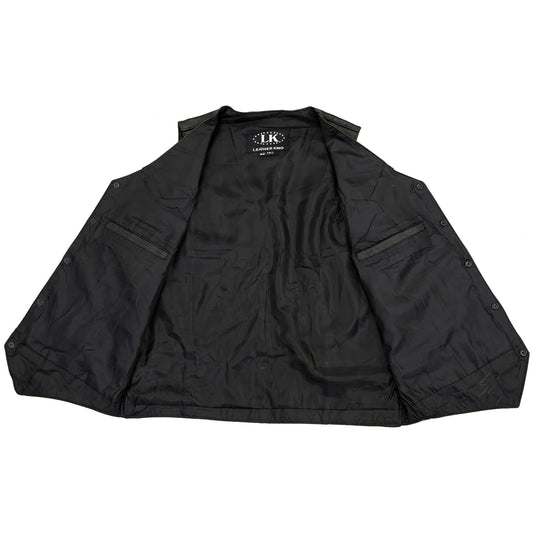 Men's Black Dual Closure Open Neck Club Style Motorcycle Leather Vest