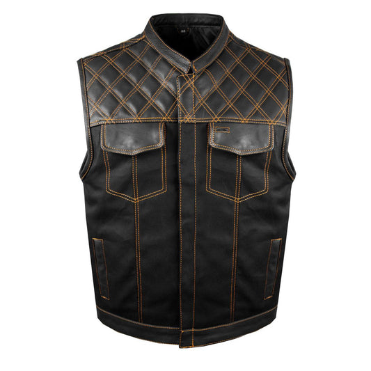 Mens Black Denim & Leather Motorcycle Club Vest Orange Thread Zipper Front, Diamond Padding