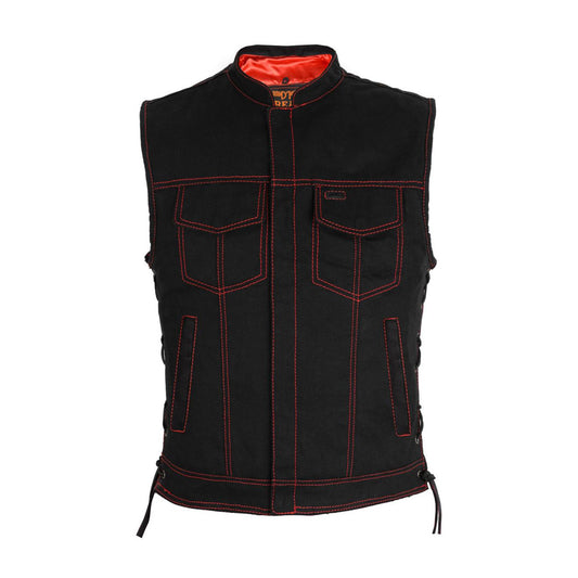 Mens SOA Style Motorcycle Club Vest® Black Denim Conceal Gun Pockets Side Laces Red Thread Red Liner