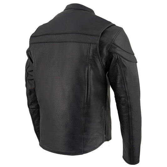 Men's Black Sporty Crossover Scooter Style Leather Motorcycle Jacket w/ Reflective Piping