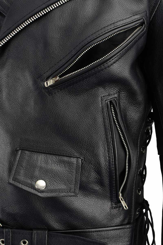 Black Leather Motorcycle Jacket for Men, Thick Brando Style Biker Jacket w/ Side Lace