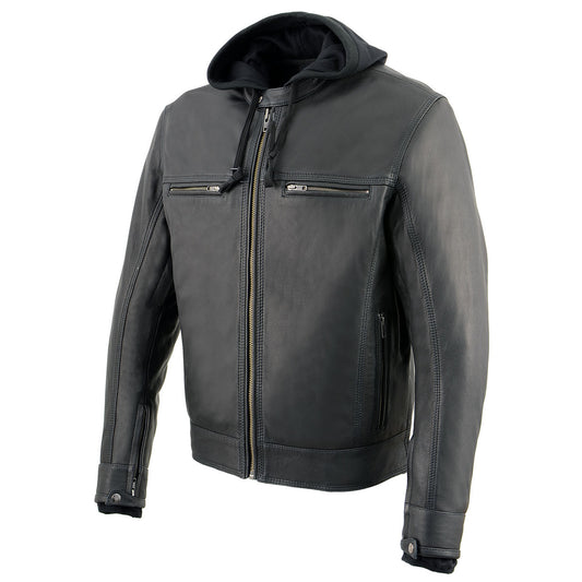 Men's Black Leather ‘Utility Pocket’ Vented Jacket with Removable Hoodie