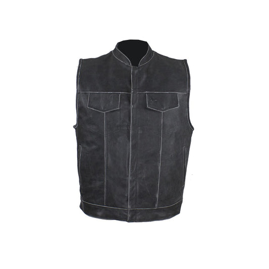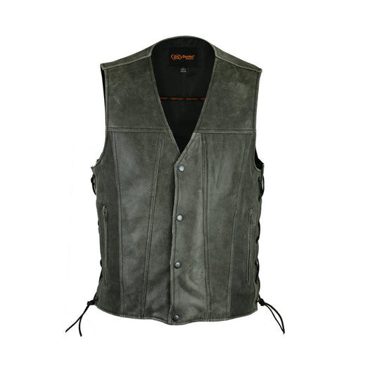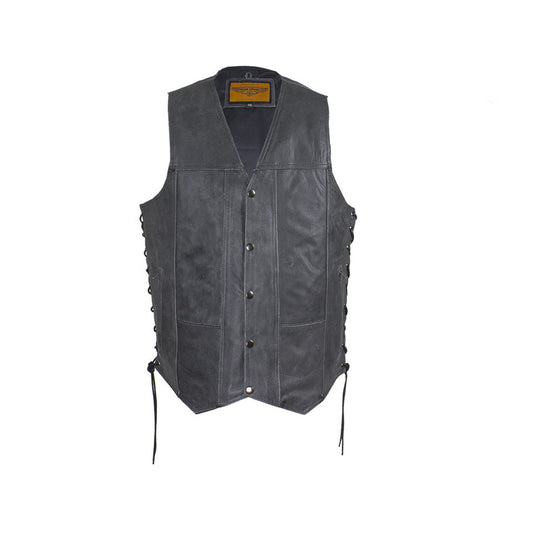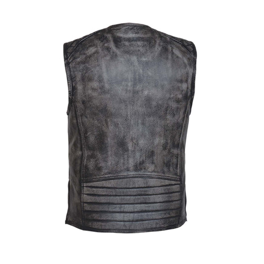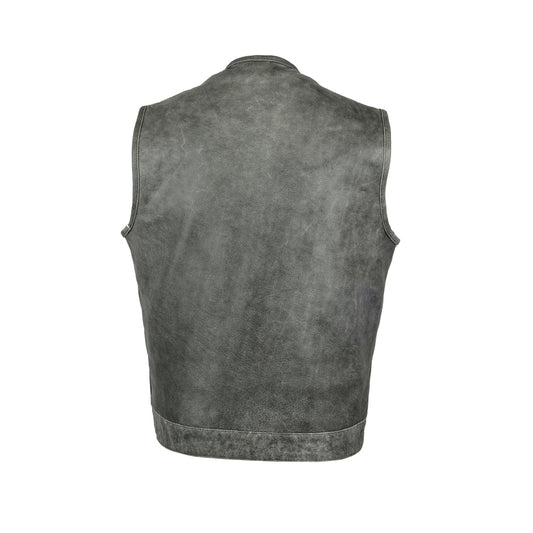 Men's Distressed Grey Dual Closure Open Neck Club Style Motorcycle Leather Vest