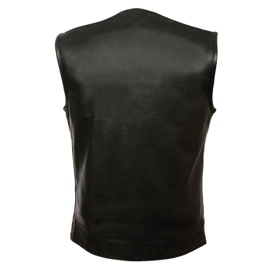Men's Black Motorcycle Club Style Leather Vest with Concealed Snap Button Closure