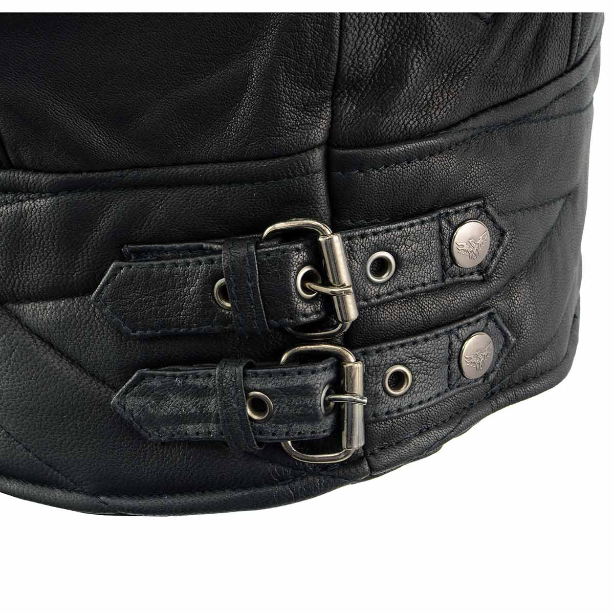 - Adjustable Dual Buckles on Side with Milwaukee Leather Branded Snap Button Closure